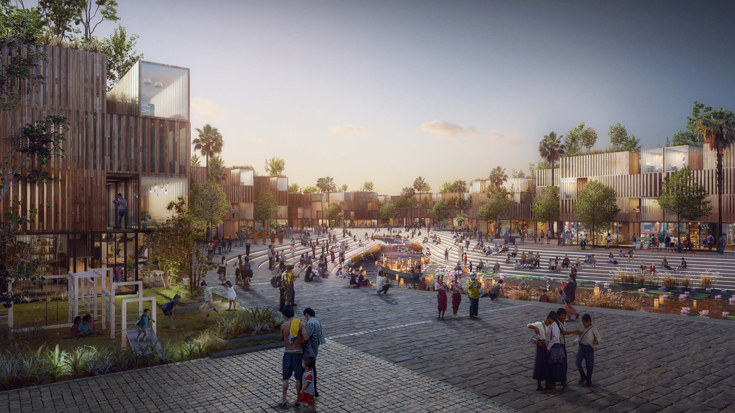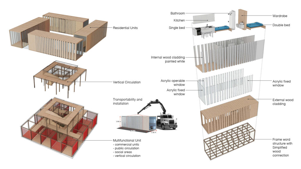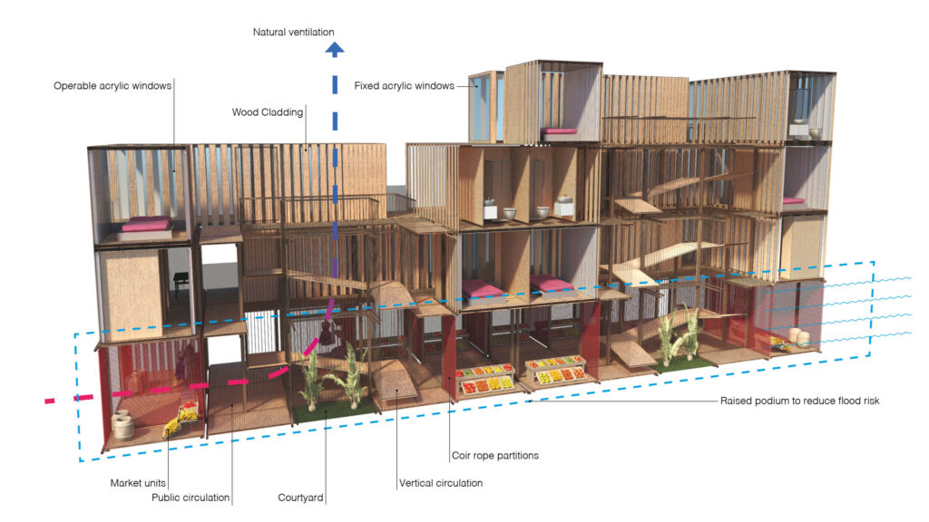 The project rethinks the traditional social housing architectural model using locally sourced renewable materials, like wood and coir ropes, and developing two primary units types: the first is the residential unit for workers, the second is a multifunctional unit that hosts public functions and works as a device to reduce damages created in case of floods. The overall development provides facilities such as health services, childcare, shops, playground, community centres, education facilities and public green areas.